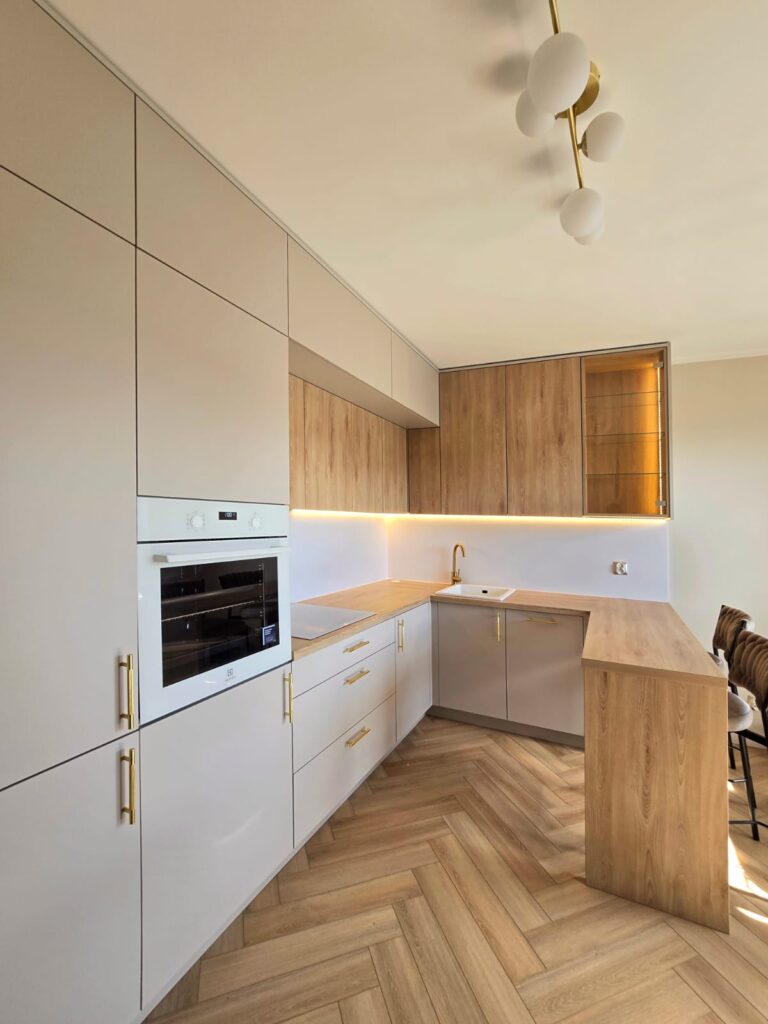 Kuchnia z Frontami Akrylowymi i Płytą Drewnopodobną Meble na Wymiar Gorzów Wielkopolski Kuchnia z frontami akrylowymi i płytą drewnopodobną to idealne połączenie nowoczesności i naturalnego wyglądu. Tego typu aranżacja łączy w sobie elegancję i funkcjonalność, tworząc przestrzeń, która jest zarówno estetyczna, jak i praktyczna. Fronty Akrylowe Fronty akrylowe są coraz bardziej popularne w nowoczesnych kuchniach. Wykonane z płyty meblowej pokrytej warstwą akrylu, charakteryzują się one wysokim połyskiem, który nadaje wnętrzu elegancki wygląd. Oto kilka zalet frontów akrylowych: Trwałość: Fronty akrylowe są odporne na zarysowania, wilgoć oraz promieniowanie UV, co sprawia, że zachowują swój wygląd przez długie lata. Łatwość w utrzymaniu czystości: Powierzchnia akrylu jest gładka i nieporowata, co ułatwia usuwanie zabrudzeń. Estetyka: Akrylowe fronty oferują głęboki połysk, który tworzy efekt szkła, dodając kuchni nowoczesnego charakteru. Płyta Drewnopodobna Płyta drewnopodobna to doskonały wybór dla tych, którzy chcą wprowadzić do swojej kuchni naturalny akcent bez konieczności stosowania litego drewna. Płyty te są dostępne w różnych wzorach i kolorach, które imitują wygląd prawdziwego drewna, oferując jednocześnie większą odporność na wilgoć i uszkodzenia mechaniczne. Koszt Kuchni Koszt kuchni z frontami akrylowymi i płytą drewnopodobną wynosi około 26 000 zł. Cena ta obejmuje zarówno materiały, jak i robociznę, a także wszelkie dodatkowe akcesoria, takie jak uchwyty, zawiasy i systemy cichego domykania. Dlaczego Warto? Inwestycja w kuchnię z frontami akrylowymi i płytą drewnopodobną to doskonały wybór dla osób ceniących sobie nowoczesny design i trwałość. Tego typu kuchnia nie tylko pięknie się prezentuje, ale również jest łatwa w utrzymaniu i odporna na codzienne użytkowanie.